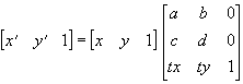 | affine | 続く6つの引数 (A ~ F パラメータ)をどのように扱うかを指定します。 真を指定すると、6つのパラメータはそれぞれ以下のように解釈されます。 A : 2Dアフィン変換行列の a B : 2Dアフィン変換行列の b C : 2Dアフィン変換行列の c D : 2Dアフィン変換行列の d E : 2Dアフィン変換行列の tx F : 2Dアフィン変換行列の ty アフィン変換により、コピー元の画像位置 (x, y) ( ただし、コピー元矩形の左上隅を (0, 0) とする ) は以下の式により、コピー先の画像位置 (x', y')に変換されます。 x' = a*x + c*y + tx y' = b*x + d*y + ty 偽を指定すると、6つのパラメータはそれぞれ以下のように解釈されます。これらのパラメータは実数での指定も受け付けます。 A : コピー元矩形の左上隅の点の、コピー先での画像位置における X 座標位置(x0) B : コピー元矩形の左上隅の点の、コピー先での画像位置における Y 座標位置(y0) C : コピー元矩形の右上隅の点の、コピー先での画像位置における X 座標位置(x1) D : コピー元矩形の右上隅の点の、コピー先での画像位置における Y 座標位置(y1) E : コピー元矩形の左下隅の点の、コピー先での画像位置における X 座標位置(x2) F : コピー元矩形の左下隅の点の、コピー先での画像位置における Y 座標位置(y2) 偽を指定した場合、コピー元の右下隅に対応する、コピー先位置(x3, y3)は自動的に以下の式によって計算されます。 x3 = x1 - x0 + x2 y3 = y1 - y0 + y2 |